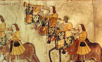 In the mid-fifteenth century, Juan II of Castile employed two African drummers in his household, and el atabalero Cristóbal el Negro served Ferdinand of Aragon between 1476 and 1500. A black drummer also served James IV of Scotland in 1504-5. At around this time, visitors to the Medinaceli court were impressed by the duke’s entrance to his dining hall, preceded by his household trumpeters and two black drummers ‘with large drums in the Moorish style’ and other musicians [‘iban delante todos sus trompetas y clarines, y dos moros con grandes tambores al estilo morisco, y otros muchos músicos’; cited in Juan García Mercadal, España vista por los extranjeros, 3 vols (Madrid, 1917-1919), I, p. 179].