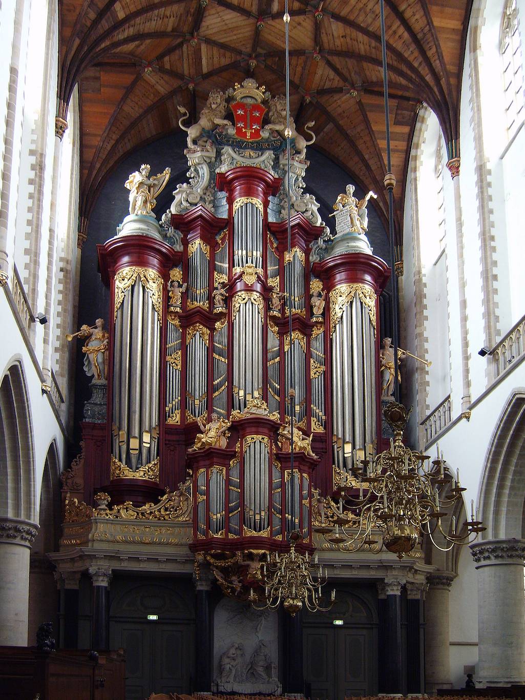 La maquinaria orgánica, de monumentales dimensiones, cerca de 30 metros (desde el suelo) y más de 5.000 tubos, fue construida entre 1735 y 1738 por el organero alemán Christian Müller (a), afincado en Amsterdam. La caja, a cuyo ornato Ponz se refiere negativamente, dado su feroz antichurriguerismo, fue probablemente realizada por Jan van Logteren. Veamos a continuación los registros que actualmente tiene este órgano. El instrumento ha tenido dos intervenciones de importancia: una en 1866, a cargo del organero de Utrecht Christian Gottlieb Friedrich Witte (b), y otra entre 1959 y 1961 realizada por la empresa danesa Marcussen & Søn (c); además se han realizado otras adiciones a la disposición original de Müller(d)