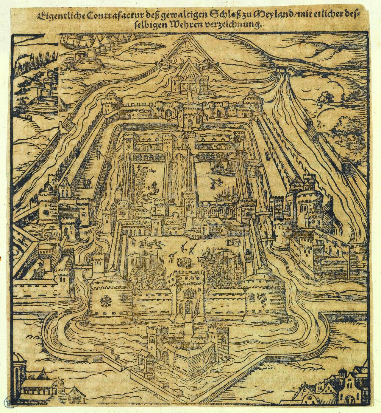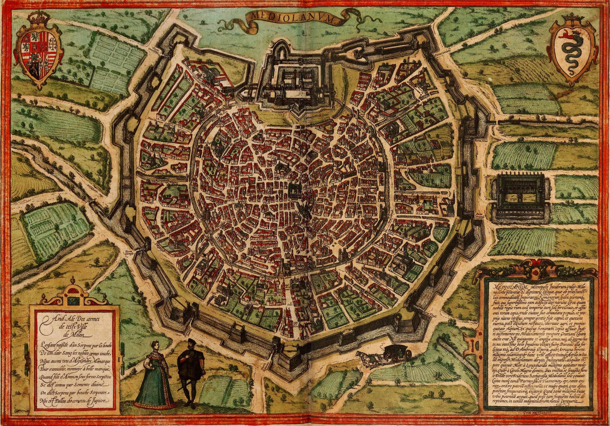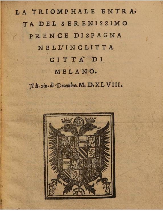 “Esperaban al príncipe en Milán con gran deseo y había en toda la ciudad general fiesta y regocijo... el concurso y multitud de gente era tanta que parecía que todo el mundo se había allí juntado para ver aquella real entrada. Apenas se podía romper por las calles por donde su alteza había de pasar. Ponían a todos admiración los arcos triunfales que en la ciudad había, ricos y de maravillosa invención y artificio. Veíase la grandeza y policía de aquella ciudad en la multitud de carros triunfales de gran primor y variedad, ricamente adornados de seda y brocados de diversas y hermosas colores, guarnecidos de lo mismo los caballos que los tiraban y los hombres que los regían...”