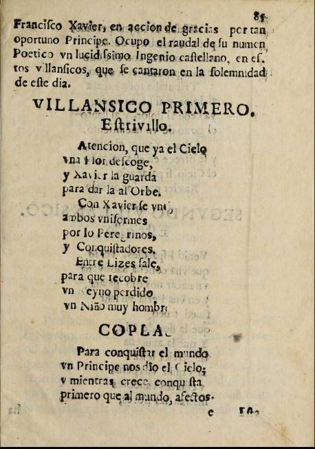 In 1708, the Society of Jesus officiated in his church in Manila nine masses to celebrate the birth of Prince Luis Fernando. At the mass of November 25, two villancicos with texts alluding to that event were performed, which exemplify the importation of this genre into the Philippines.