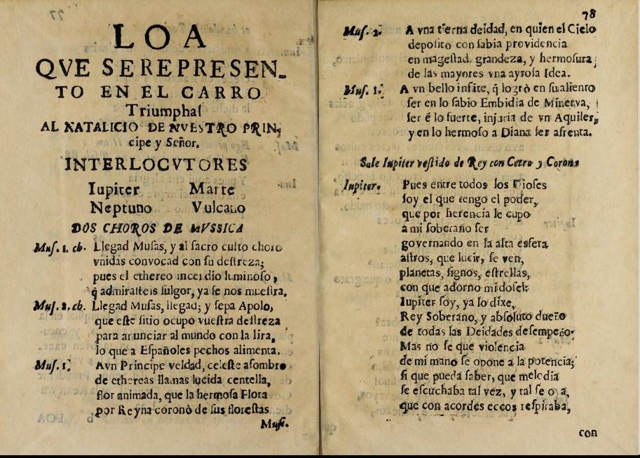 Finalizado el vejamen, el cortejo, con su carro triunfal, entró en la plaza Real en la que, “después de varias escaramuzas y encuentros que con destreza tuvieron también ejercitados jinetes”, acercaron el carro a los balcones del palacio del gobernador. En presencia de este, representaron una loa dedicada al nacimiento del príncipe, en la que participaban cuatro actores que personificaban a Júpiter, Marte, Neptuno y Vulcano y los dos coros de música que iban en él.