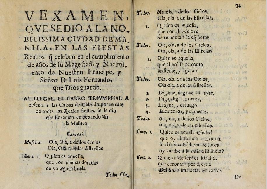 To the celebrations to commemorate the birth of Prince Luis Fernando celebrated in Manila, in 1708, those organized on the occasion of his father King Felipe V's birthday were added. A promenade, accompanied by a large triumphal carriage, was his main festive element. In the Plaza Real, at the foot of the municipal council houses and the Governor's Palace, theatrical performances of a vejamen and two loas took place, which were accompanied by the two musical choirs that were in the aforementioned triumphal carriage.
