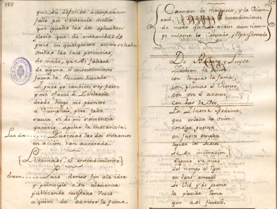 El copista de este manuscrito es Lorenzo Almón Pereira, nombrado en 1737 como “copiante de música de los señores infantes y señoras infantas”. Al parecer seguía en activo en 1746, lo que permite datar la copia en torno a esas fechas. La primera de las dos obras es el Coloquio entre las tres potencias para la profesión de las señoras doña Luisa y doña Bárbara Cherberlier, religiosas en el convento de Santa Catalina de Zafra [pp. 180-189]. La pieza termina con un pasaje cantado alusivo a las dos hermanas, “De Bárbara y Luisa” que lleva la siguiente acotación: [“Cantan la Memoria y la Voluntad y representa el Entendimiento de modo que se acabe a un tiempo mismo lo cantado y representado”].