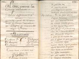 Theatrical performances in Hispanic female convents are generally related to liturgical, ceremonial and festive events that may be periodic or sporadic and whose texts are grouped under the label of "conventual theater." In the first half of the 18th century, in the convent of Santa Catalina de Zafra, on the occasion of the profession of two nuns and the appointment of a prioress, a Coloquio, a Loa and the play Los deprecios de quien ama by Juan Pérez of Montalván were performed, in which we find, as usual, various sung passages.
