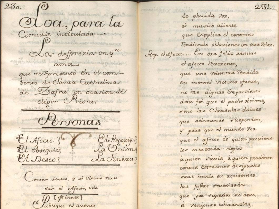 La segunda obra es una Loa para la comedia intitulada Los desprecios en quien ama que se representó en el convento de Santa Catalina de Zafra con ocasión de eligir priora [pp. 230-236]. Se inicia y se acaba con partes cantadas, la última el “minuet” “Gobierne dichosa” que lleva la acotación: [ “cantan el Afecto, el Obsequio y la Fineza y representan la Unión, el Deseo y el Regocijo lo mismo que los demás cantan, procurando empezar de modo que acaben iguales”]. La comedia Los desprecios en quien ama tiene una atribución dudosa a Lope de Vega y es mayoritariamente atribuida a Juan Pérez de Montalván.