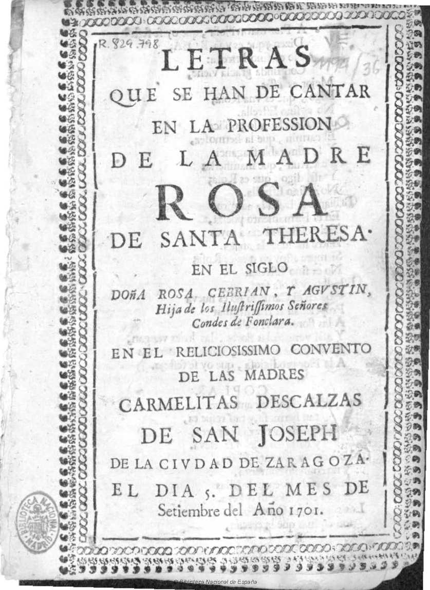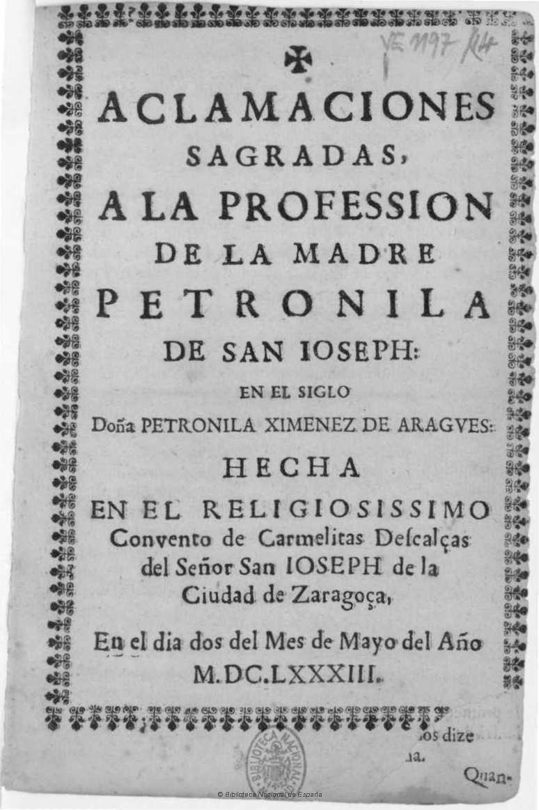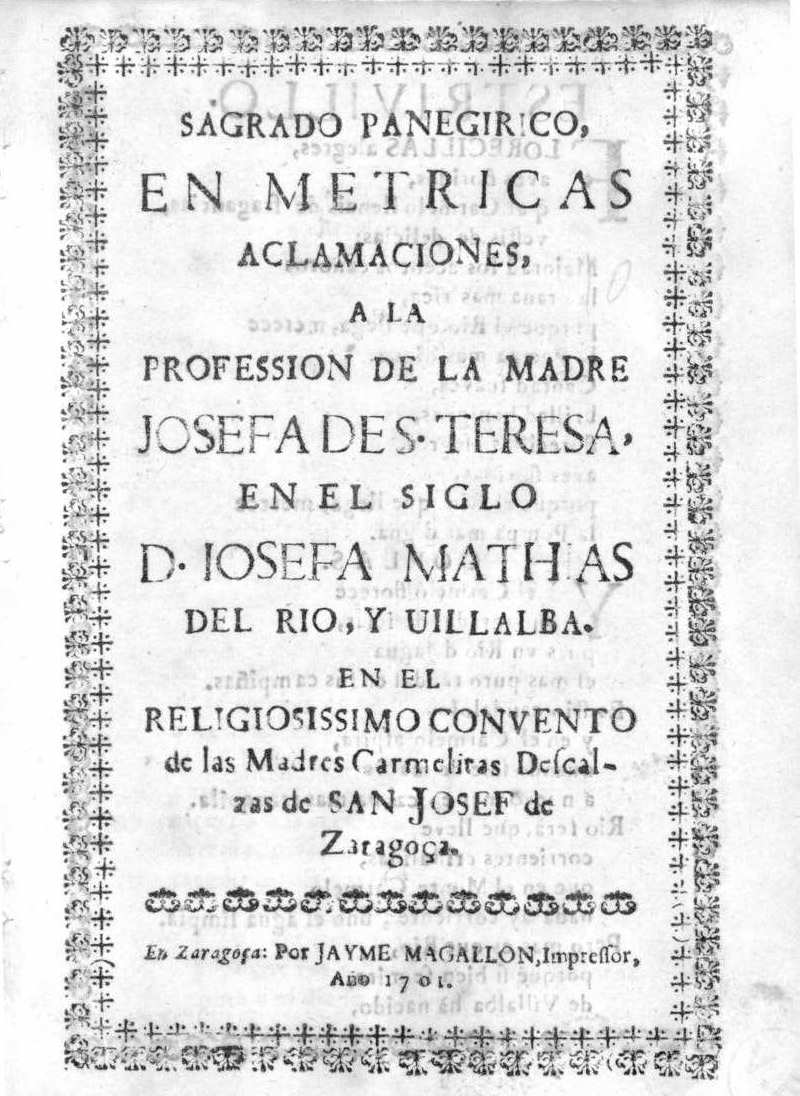 This event is devoted to the extant printed texts that were written for villancicos (sacred songs) composed for the profession of Discalced Carmelites nuns in the convent of San José in Zaragoza (1683-1754).