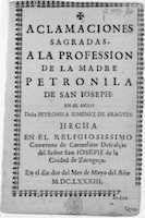 * El primero data de 1683 y es uno de los primeros conservados dedicados a esta ceremonia en la ciudad de Zaragoza. En él encontramos los textos de los villancicos para la toma de velo de Petronila de San José, en el siglo Petronila Jiménez de Aragües, que se cantaron el 2 de mayo de 1683.