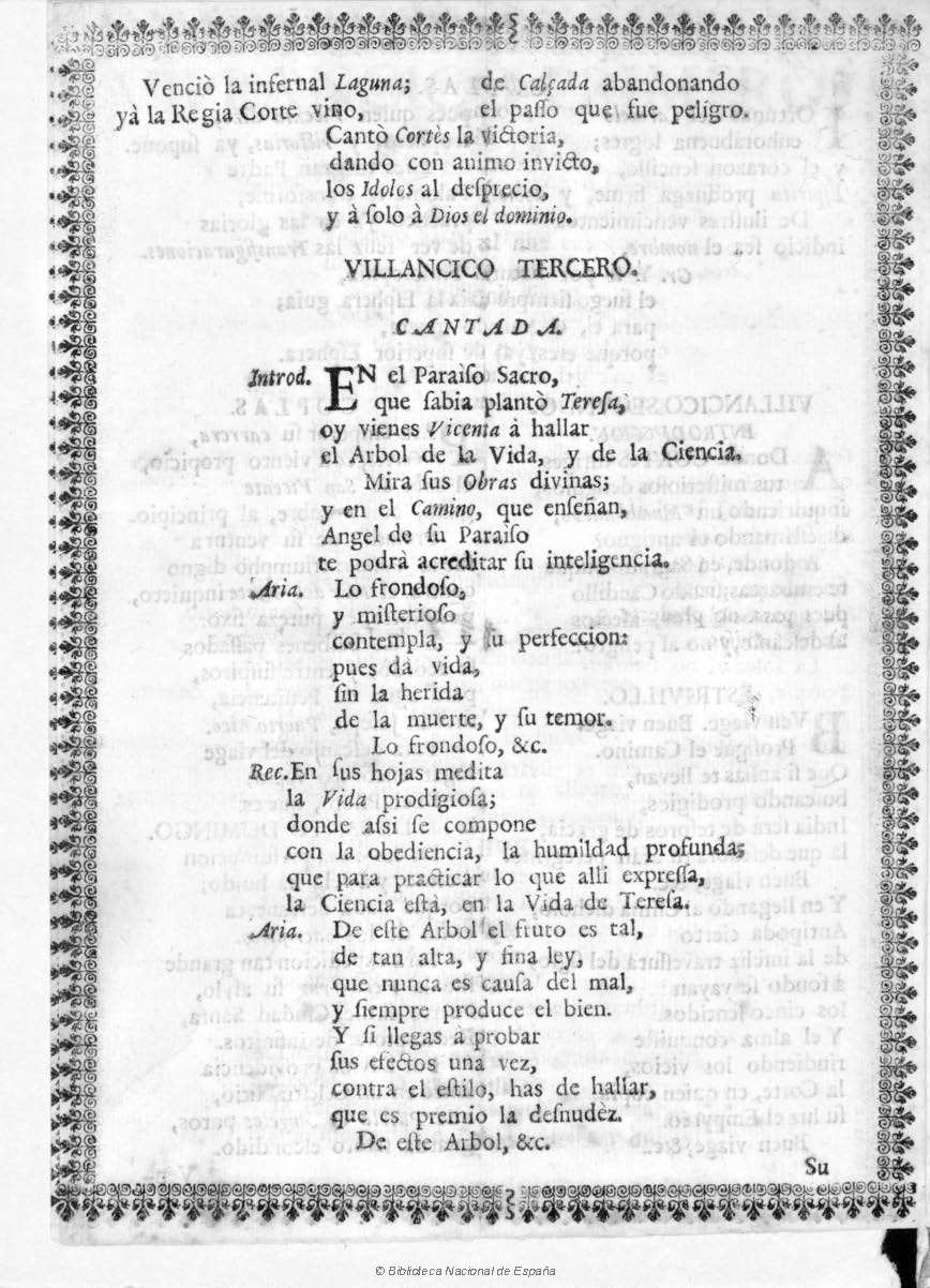 3. Villancico tercero. Cantada. Introducción: “En el Paraíso sacro” / Aria: “Lo frondoso” / Recitado: “En sus hojas medita” / Aria: “De este árbol el fruto es tal” / Recitado: “Su raíz es la Regla Primitiva” / Aria: “Logra el fruto y buen olor” / Coplas: “Su amenidad discurre”.