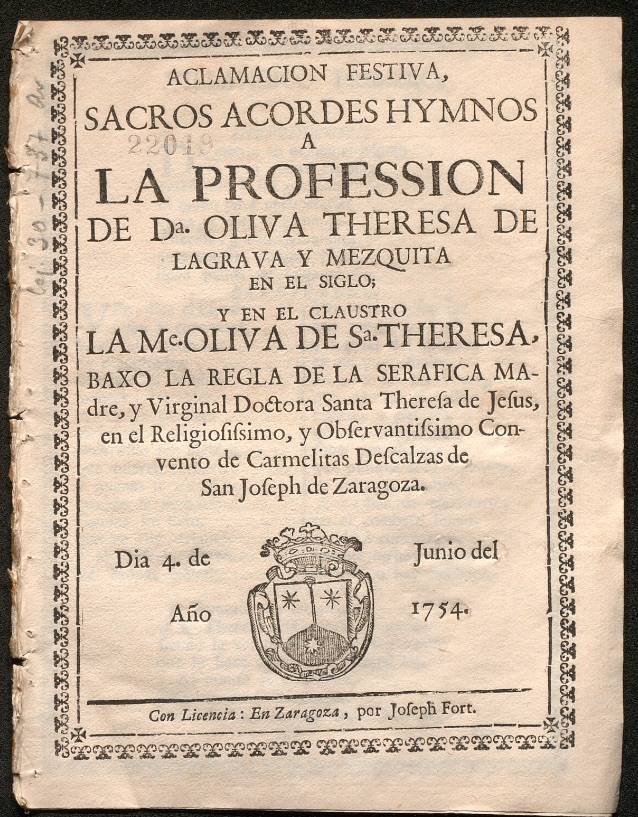 - El sexto pliego, Aclamación festiva, sacros acordes hymnos..., presenta la peculiaridad de que se ha conservado también una versión manuscrita en la Biblioteca de la Universidad de Zaragoza, Fondo Antiguo, Ms. 73. Contiene los villancicos compuesto para la toma de velo de la madre Oliva de Santa Teresa, en el siglo Oliva Teresa de Lagrava y Mezquita, que tuvo lugar el 4 de junio de 1754.