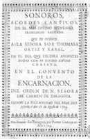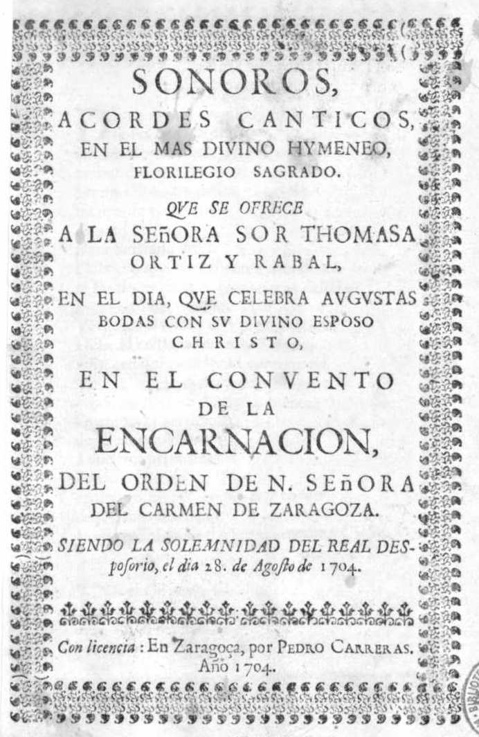 - El primero, Sonoros acordes cánticos en el mas divino himeneo..., recoge los villancicos compuesto para “las augustas bodas con su divino esposo Christo” de sor Tomasa Ortiz y Rabal que tuvieron lugar el 28 de agosto de 1704.