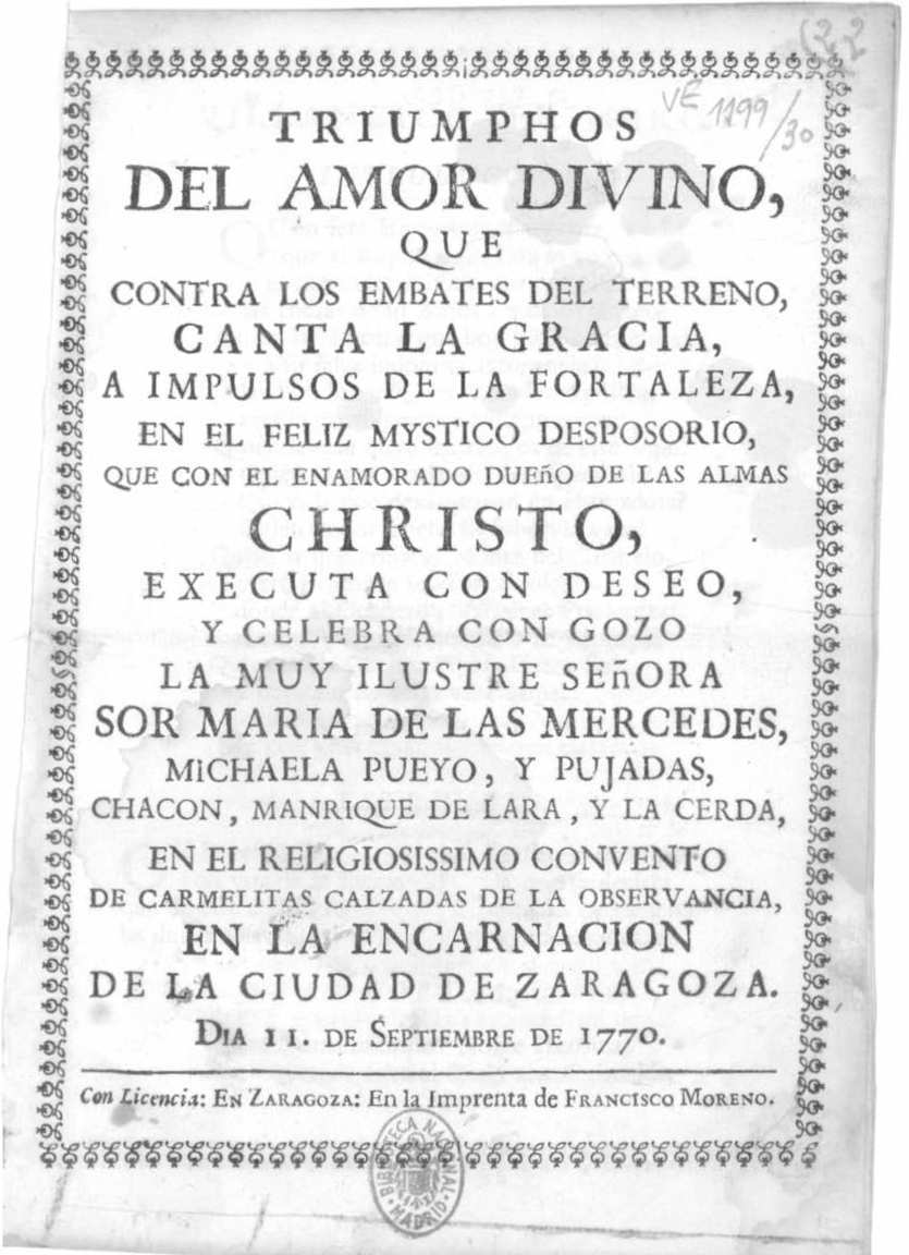 - El tercer y último pliego de este cenobio carmelita es de la segunda mitad del siglo XVIII. Los villancicos fueron compuestos para “el feliz místico desposorio” de “la muy ilustre señora” sor María de las Mercedes, que en el siglo fue Micaela Pueyo y Pujadas Chacón Manrique de Lara y la Cerda (nieta de Francisco Miguel de Pueyo Herrera, virrey de Mallorca, gobernador de Aragón y consejero de Guerra), el cual se celebró el día 11 de septiembre de 1770.