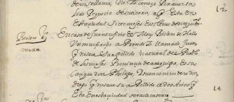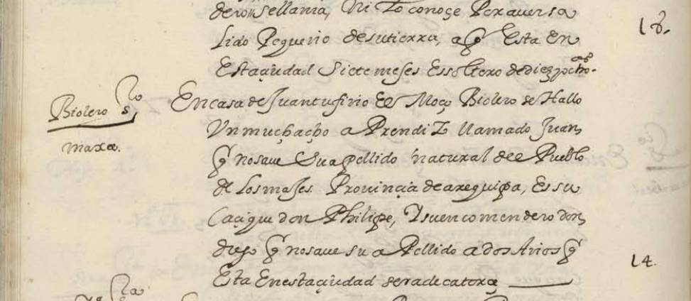 Fol. 70v “[Al margen: Violero, soltero, Majes] En casa de Juan Tufino, el Mozo, violero, se halló un muchacho aprendiz llamado Juan, que no sabe su apellido, natural del pueblo de los Majes, provincia de Arequipa. Este tiene al muchacho de 14 años. Es su cacique don Phelipe, y su encomendero don Diego, que no sabe su apellido, a dos años que está en esta ciudad, será de catorce”.