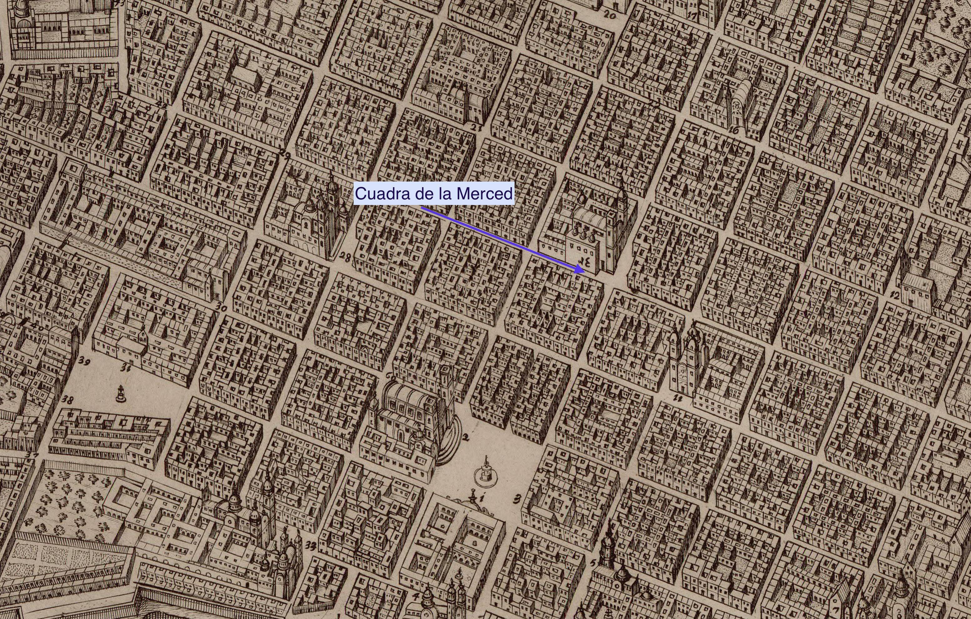 En la “cuadra de la Merced que va para las casas del señor doctor Montalvo, oidor de la Real Audiencia”, encontramos: