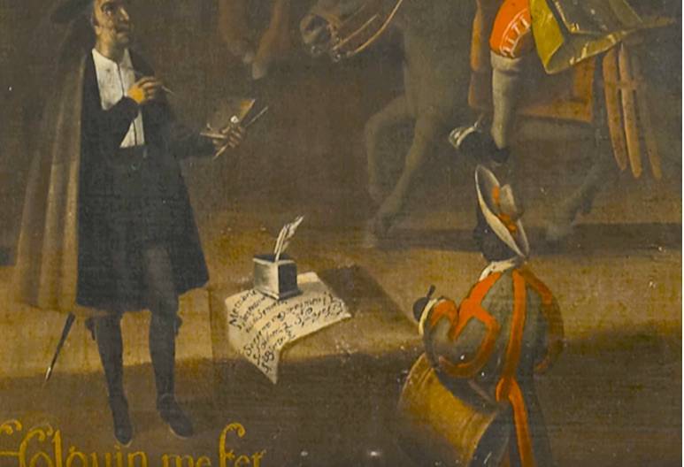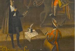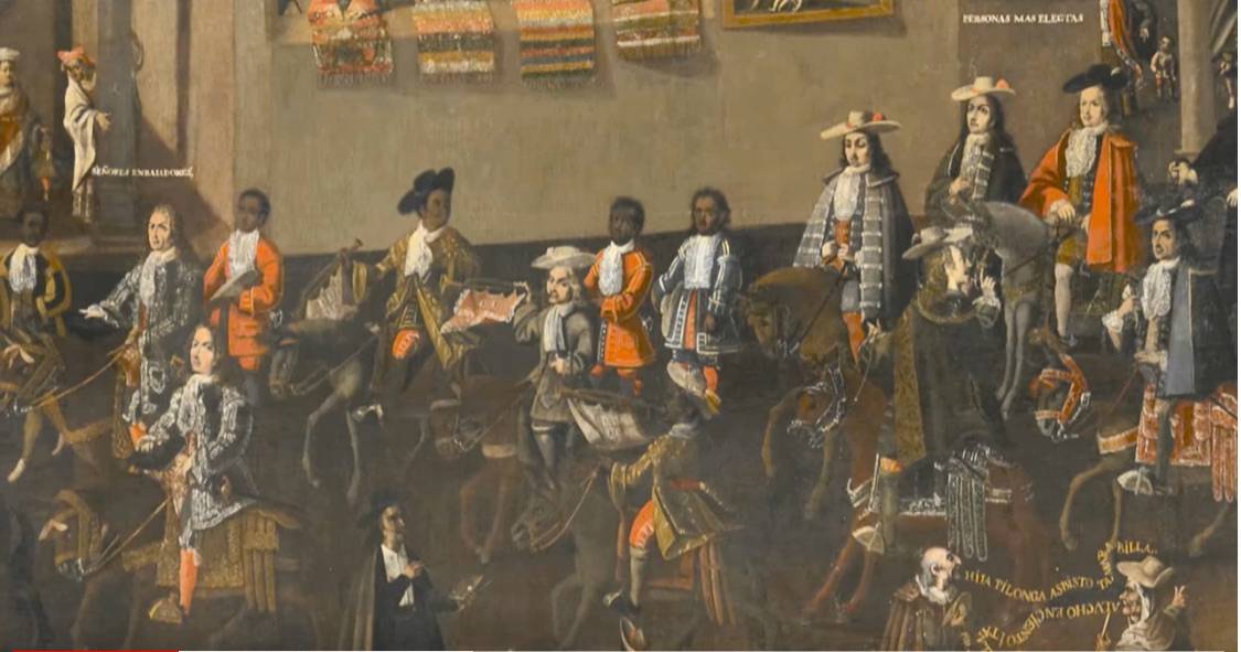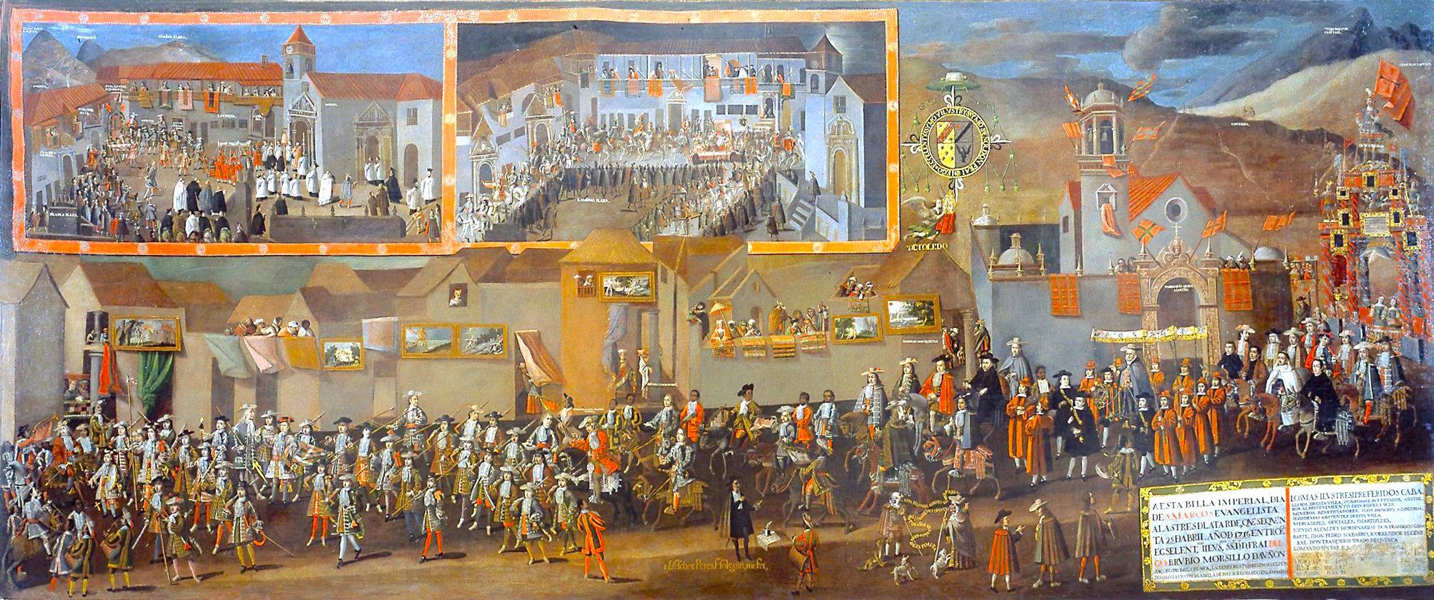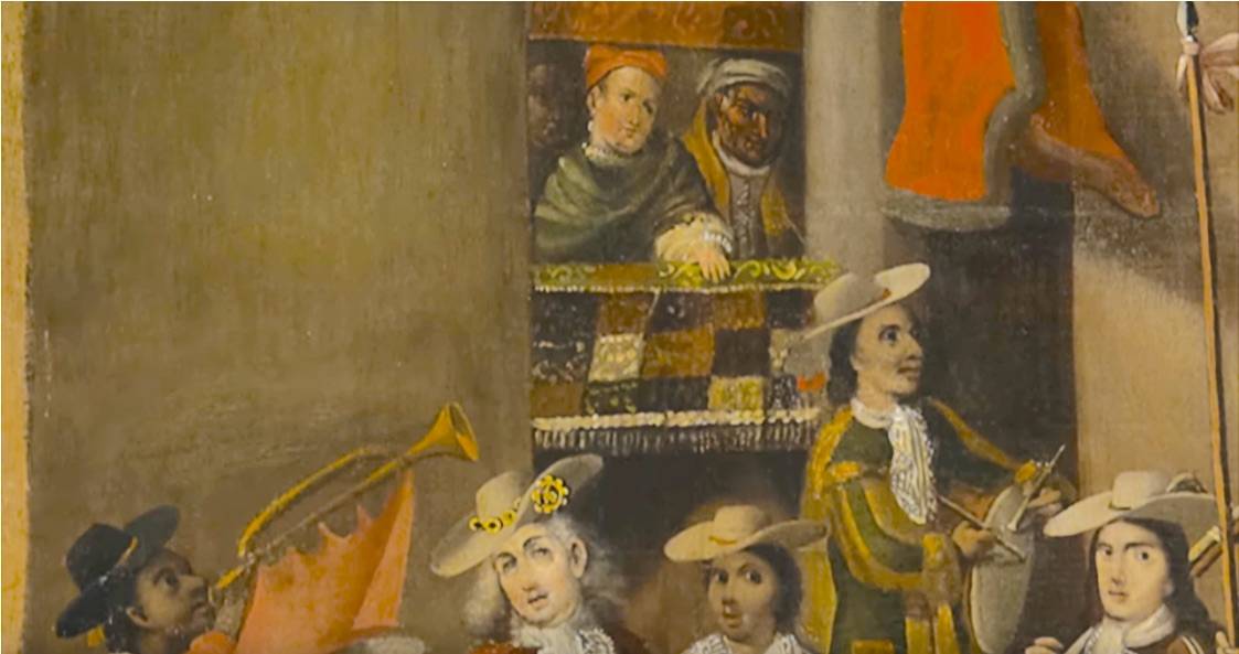En esta minuciosa descripción de la entrada y estancia de Diego Morcillo Rubio Auñón en la ciudad de Potosí encontramos todos los elementos sónicos característicos de la fiesta barroca que adquieren su particular identidad de la mano de las manifestaciones populares autóctonas que se hibridan con las importadas de la metrópoli creando un paisaje sonoro propio y único. Para finalizar este evento contamos con un tercer documento de extraordinaria importancia, en este caso iconográfico. Se trata del singular lienzo de Melchor Pérez de Holguín, testigo presencial que se autorretrata pintando el evento, en el cual podemos visualizar distintas escenas de lo acontecido en la entrada y estancia del virrey en Potosí, complemento de inestimable valor a las descripciones que nos proporcionan Bartolomé Arzáns de Orsúa y fray Juan de la Torre. En este cuadro, Pérez de Holguín incorpora, en el cortejo de entrada, los trompetas y tambores citados por los cronistas, los cuales, como el resto de los personajes retratados, reflejan la diversidad étnica del Virreinato del Perú, y en la escena de la máscara un remedo del carro triunfal, solo con algunos de sus elementos, situando al lado de la puerta de la casa del corregidor a los músicos, los cuales ilustra con un cantor acompañado por dos instrumentistas que tañen un arpa y una vihuela de arco.