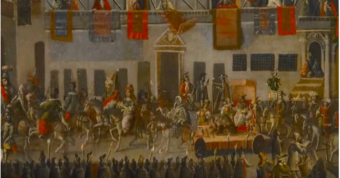 announcement , the pealing of bells , street music , illuminations , mass , traditional dances , ephemeral architecture , musket salute , loa (a short theatrical piece) , theatre performance , movable platforms for theatrical representations , applausses , bustle in the street , cheers , sound of animals , masquerade , bullfights , fireworks , Diego Morcillo Rubio Auñón (archbishop, viceroy of Perú) , nobility , music chapel , clergy , city council , children , musicians , actor-singers , horses , crowd , trumpets , drum players , drum player , shawn player , Antonio Durán de la Mota (chapel master, composer)