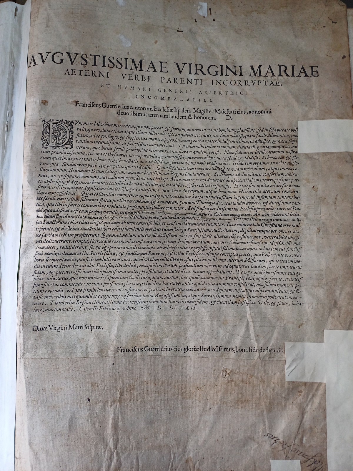 * [35] “Otro de magníficats de Guerrero impreso”. En este caso no hay duda de que se trataba de un ejemplar del Canticum Beatae Mariae (Lovaina: Pierre Phàlese, 1583), actualmente perdido.