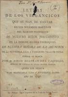 * Letras de los villancicos que se han de cantar en los ... maytines del Sagrado Nacimiento de Nuestro Señor Jesuchristo en la ... Iglesia Parroquial de Nuestra Señora de la Asunción de ... Yecla, puestos en música por D. Diego Beltrán del Castillo maestro de capilla de dicha insigne iglesia quien los dedica a su respetable cura y reverendo clero. Año de 1797: