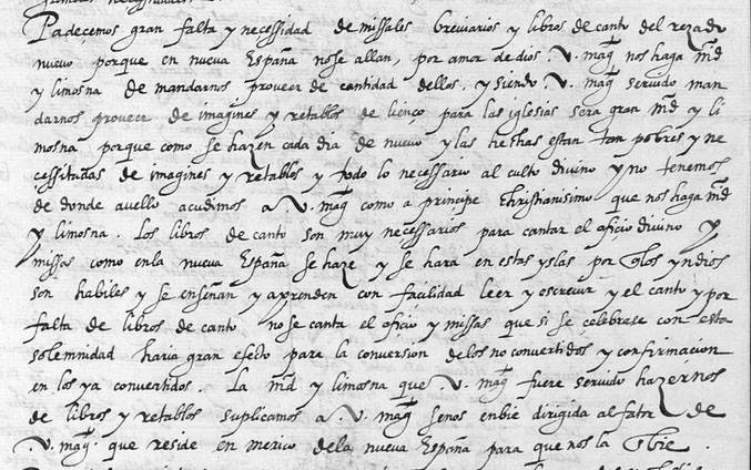 “Padecemos gran falta y necesidad de misales, breviarios y libros de canto del rezado nuevo, porque en Nueva España no se hallan, por amor de Dios, V. Majestad nos haga merced y limosna de mandarnos proveer de cantidad dellos y siendo V. Magestad servido mandarnos proveer de imágenes y retablos de lienzo para las iglesias será gran merced y limosna, porque como se hacen cada día de nuevo y las hechas están tan pobres y necesitadas de imágines [sic] y retablos y todo lo necesario al culto divino no tenemos de donde habello... Los libros de canto son muy necesarios para cantar el oficio divino y misas como en la Nueva España se hace y se hará en estas islas porque los indios son hábiles y se enseñan y aprenden con facilidad leer y escrebir y el canto y por falta de libros de canto no se canta el oficio y misas que si se celebrasen con esta solemnidad haría gran efecto para la conversión de los no convertidos y confirmación en los ya convertidos. La merced y limosna que V. M. fuere servido hacernos de libros y retablos suplicamos a V. M. se nos envíe dirigida al factor de V. M. que reside en México de la Nueva España para que nos la envíe”.