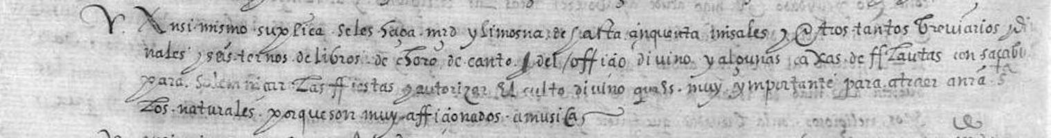 Ansimismo suplica se les haga merced y limosna de hasta cincuenta misales y otros tantos breviarios y diurnales y seis ternos [18] de libros de choro de canto del oficio divino y algunas cajas de flautas con sacabu[ches] para solemnizar las fiestas y autorizar el culto divino que es muy importante para atraer a Nuestra Santa [Iglesia] los naturales porque son muy aficionados a música”.