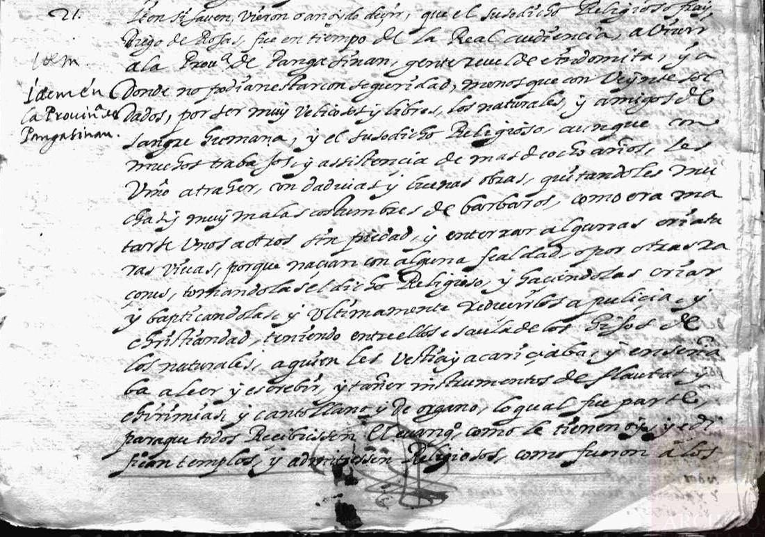 Fol. 48v. “A la veinte preguntas dijo que lo que della sabe es que debe de haber quinçe años poco más o menos que por orden y mandado de don Gonzalo Ronquillo governador que a la saçón era fue Juan Pablos de Carrión a paçificar a la provincia de Cagayán que se había alçado y en su compañía fue el padre fray Diego de Rojas el qual con su buena vida e costumbres hizo traer de paz mucha gente de las que se habían alçado e faeriço una yglesia a donde acudía a la administración de los sacramentos...”