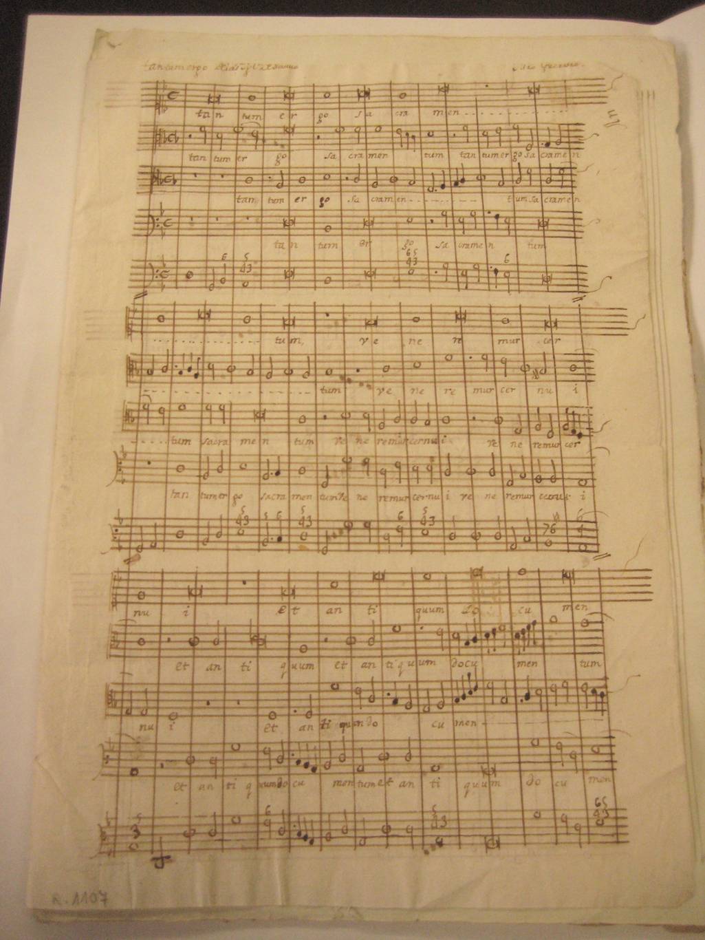 El himno está escrito en formato de partitura, a cuatro voces con el añadido de un bajo cifrado. El título “Tantum ergo de las Iglesias de Sevilla”, colocado en la parte superior, pone de manifiesto su difusión y uso generalizado en los establecimientos del clero regular y secular de la ciudad.