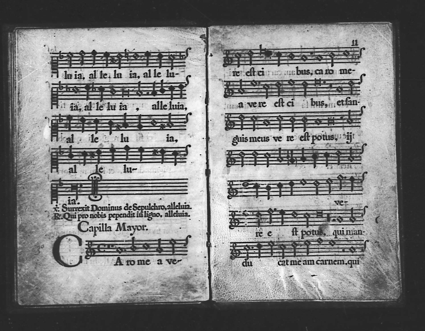 - Caro mea vere est cibus. “Capilla mayor”. [Francisco Guerrero]. Impreso en las ediciones venecianas de 1589 y 1597. Este motete pudo estar copiado en uno de los libros del inventario de 1667: “Otro juego de motetes, donde están los de la mañana de Resurrección, a cuatro, son cuatro libretes, manuscripto”. Esta hipótesis se sustenta en el hecho de que en los Libros pajizos están escritos los cinco motetes que se cantaban en la procesión de los Maitines de la festividad de la Resurrección, con la indicación precisa de la estación en la que debía cantarse cada uno de ellos, los cuales pudieron copiarse de esa fuente más antigua. Véase: http://www.historicalsoundscapes.com/evento/218/granada/es.