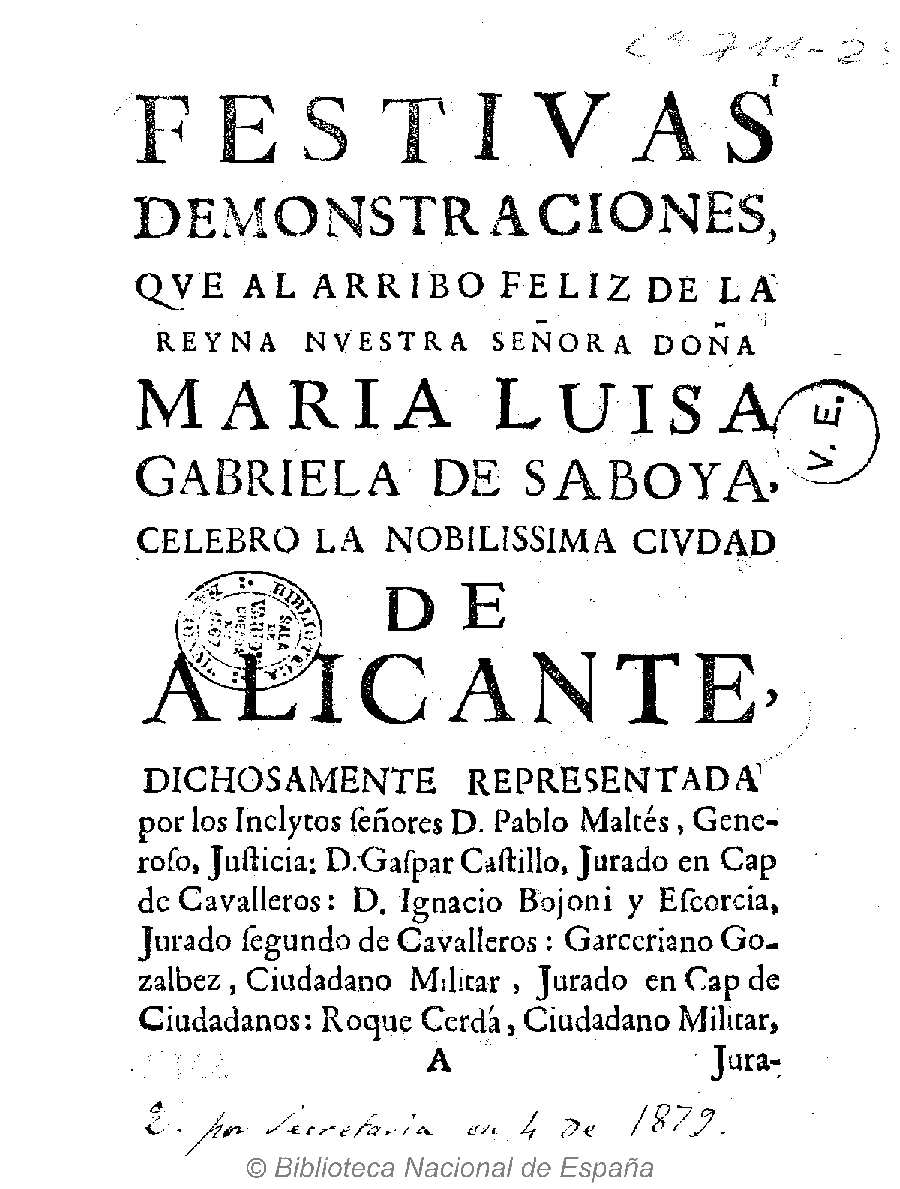 La noticia de la llegada a España de María Luisa Gabriela de Saboya y sus esponsales con Felipe V se recibió en el cabildo de la ciudad de Alicante el 19 de noviembre de 1701. La hija del duque de Saboya tenía solo 13 años cuando se casó, en Figueras, el 2 de noviembre de ese año. Rápidamente, se organizaron los festejos para celebrar este importante acontecimiento para la monarquía hispana. Los detalles de esa celebración son relatados por José Franqui y Paulín en un pliego sin fecha impreso en Orihuela por Jayme Mesnier. Su descripción está plagada de referencias al impacto sensorial de las distintas manifestaciones festivas, lo cual lo hace particularmente interesante.