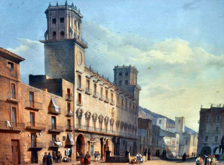 Para la representación teatral, en la plaza del Mar (actualmente plaza del Ayuntamiento), a la que asistió una “inmumerable multitud”, se dispuso un tablado elevado enfrente de los balcones del ayuntamiento. Desconozco si el pilar y la fuente que se aprecian en el grabado de Louis Jules Arnout (1814-1868) estarían ya en esta plaza, sumándose el sonido del agua a resto de los componentes que influirían en las dificultades para escuchar la comedia representada, como señala el cronista: