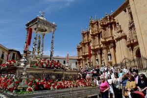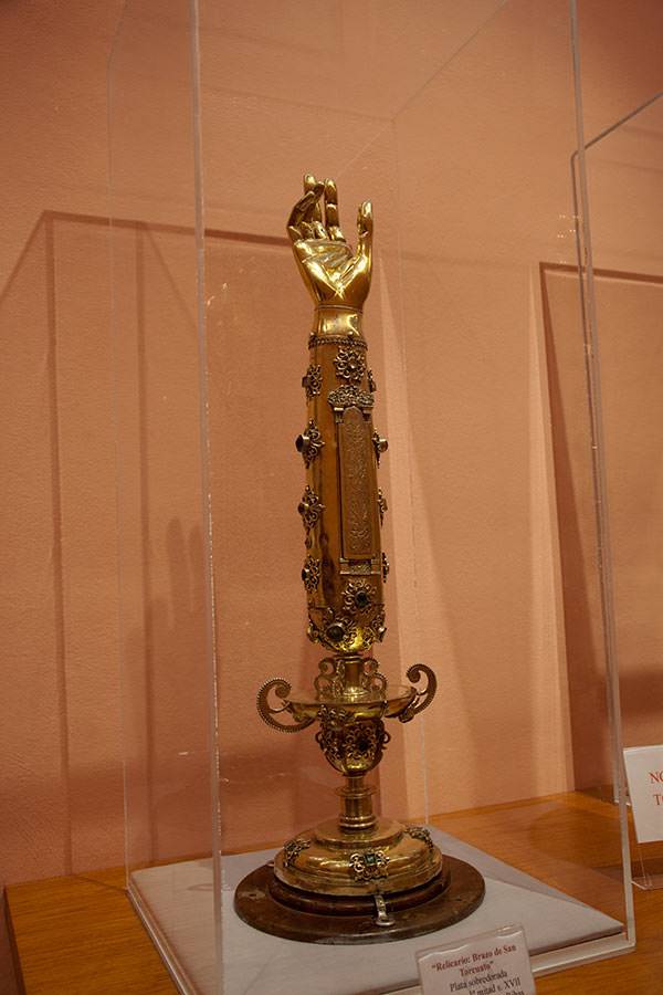 Llegados a la ermita de San Lázaro, el obispo, que iba revestido de pontifical, extrajo las reliquias para colocarlas: “en el hueco de un brazo que para este fin se había hecho, sobredorado, escarciado y labrado con primor, el cual se puso sobre unas andas de cuatro columnas de plata, ricamente adornadas, que también se previnieron”.