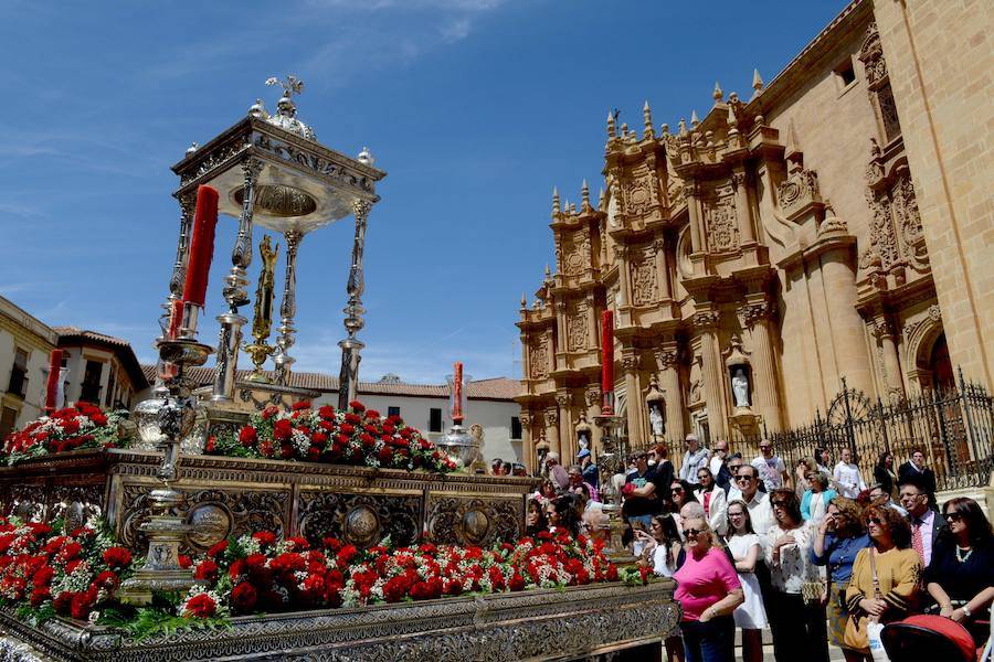 Tras su salida de la ermita de San Lázaro, la procesión continuó su itinerario “por el camino de Granada a la puerta de Bezamarín, que ahora llaman de San Torcuato. Hiciéronse tres mansiones en tres altares que en el camino están ricamente adornados, el uno por la Universidad o Cabildo de Beneficiados de Guadix, otro por los religiosos de los conventos de Santo Domingo y San Francisco y el otro por el regimiento y capitulares de la misma ciudad”. No se especifica dónde estaban ubicados estos altares ni el recorrido preciso que se siguió hasta la catedral, a la que la comitiva llegó a las cuatro de la tarde.