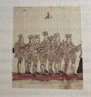 - Una danza de sarao con ocho hombres con vestiduras de tabí de colores con franjones de oro, cuatro de ellos con vestiduras de mujer y los otros cuatro de galanes con ocho instrumentos; todos con sus penachos de plumas y mangas nuevas de escamadillo de colores.