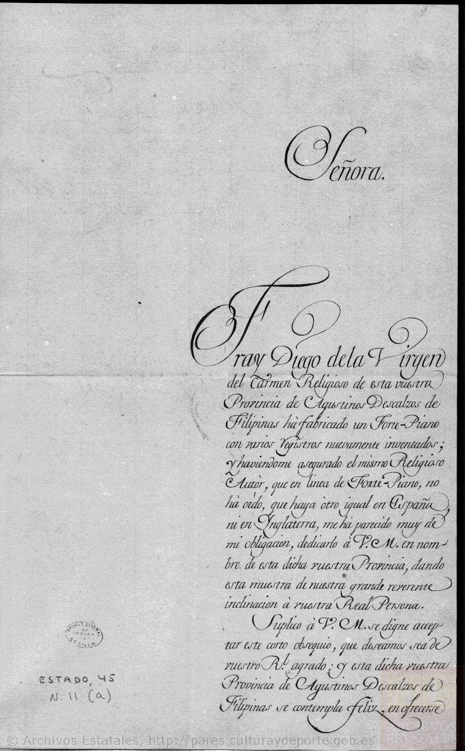 Fray Diego de la Virgen del Carmen, religioso de esta vuestra provincia de agustinos descalzos de Filipinas ha fabricado un forte-piano con varios registros nuevamente inventados; no ha oído que haya otro igual en España ni en Inglaterra, me ha parecido muy de mi obligación dedicarlo a V. M. en nombre de esta dicha vuestra provincia, dando esta muestra de nuestra grande reverente inclinación a vuestra Real Persona.”