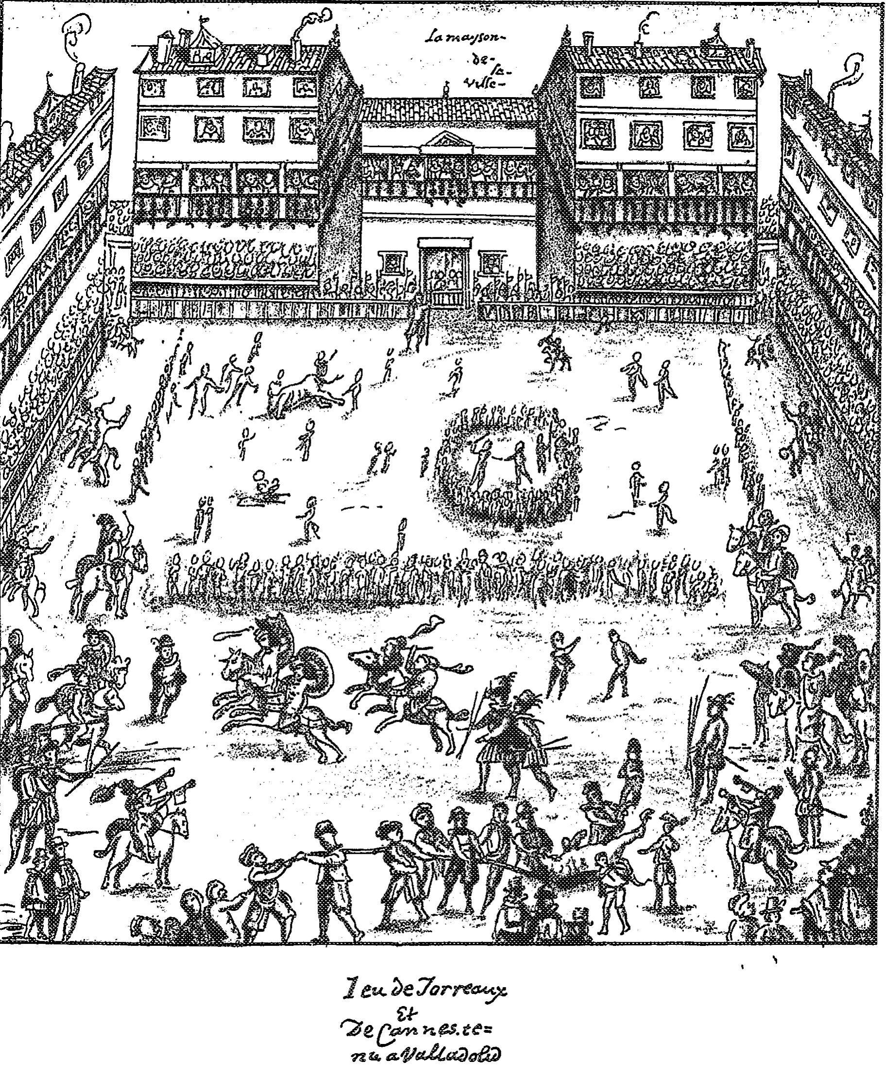 Jean de L'Hermite, ayuda de cámara del rey Felipe II, en Le passetemps, nos proporciona una de las escasas imágenes que tenemos de uno de los entretenimientos más destacados en las principales fiestas urbanas que desde la Edad Media se celebraban en las coronas hispanas: los juegos de toros y cañas. La ilustración acompaña a una minuciosa descripción del espectáculo que la ciudad de Valladolid ofreció al monarca Felipe II con ocasión de la visita realizada durante el veranode 1592, acompañado del príncipe heredero don Felipe y de la infanta Isabel Clara Eugenia. Los juegos de toros y cañas que nos ocupan en este artículo tuvieron lugar el 11 de julio. La plaza, reconstruida tras el voraz incendio de septiembre de 1561, se limpió y cubrió con arena procedente del lecho del Pisuerga. Se cerraron todas las entradas y se instalaron los toriles y tres tablados forrados de tela verde para asistir al festejo. La familia real se acomodó en las ventanas del ayuntamiento, el cual fue adornado efímeramente para la ocasión. El espectáculo comenzó con la presentación de las doscuadrillas más destacadas que posteriormente participarían en el juegos de cañas, la de Juan Téllez-Girón y Guzmán, IIduque de Osuna y I marqués de Peñafiel, y la de Pedro de Toledo, V marqués de Villafranca: “ayant devant eulx 80 laquays de leurs livrées et un chascun en main plusieurs cannes ou roseaux, fust commandé à son de trompettes et esclarions [= clarions] qu’on deust laisser sortir le premier tourreau”. Las otras cuatro cuadrillas que completarían el número de seis estaban capitaneadas por Luis III Enríquez de Cabrera Mendoza, primogénito del VII Almirante de Castilla, Luis II Enríquez de Cabrera; por el segundo de sus hijos, Diego, caballero de la orden de Santiago y por los dos corregidores de la ciudad, “le vieu et le moderne”. El juego taurino se prolongó durante “trois ou quatre heures” hasta que se ordenó que comenzara el juego de cañas y es objeto de una dura crítica por parte de L'Hermite: