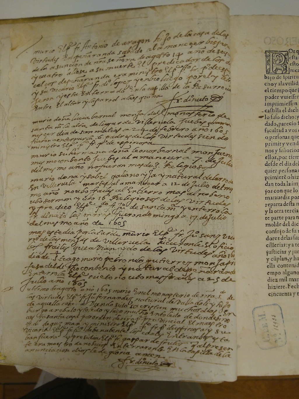 “Último de agosto año 1605 murió en el monasterio de Nuestra Señora de las Virtudes el padre fray Juan Fernández, natural de Valladolid y hijo de aquella casa, habiendo sido sacristán muchos días en Burgos, Arévalo y Toledo y hizo mucho en Toledo de donde vino a esta santa casa por orden de nuestro padre provincial el maestro fray Diego de Guzmán [c.1541-1602] y ministro el padre fray Pedro de Espinosa y su vicario el padre fray Francisco de Benavente los cuales entrambos estaban fuera y presidía el padre fray Gaspar de Frutos que al presente era maestro de novicios. Enterráronle en la capilla de la Anunciación, Dios le de gloria amen. Fray Diego Nieto (rúbrica)”.