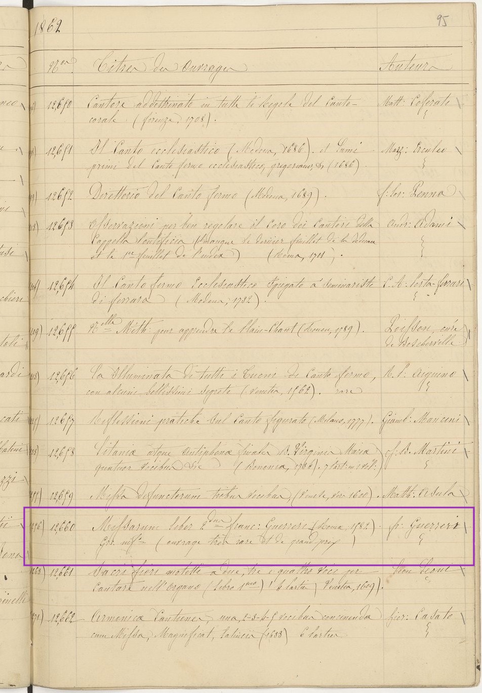 Este volumen aparece registrado en RISM, serie A, vol. 3 (1972), p. 395 [G 4872], en el cual se da como localización la Bibliothèque du Conservatoire de París. El impreso de Guerrero lleva en la portada (ver recurso) el sello de esta Biblioteca con el número de registro 12660. Efectivamente, este impreso se encuentra inventariado en el volumen manuscrito de los fondos de esa institución que abarca los números 9366 a 18157 (fol. 95r, ver recurso). En su registro se precisa que era una: “ouvrage très rare et de grand prix”. Su entrada se realizó en 1862, sin que se especifique la procedencia de este impreso, la cual queda aclarada por una nota que encontramos en el fol. 94r: