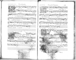 En el fol. 71v, se ha despegado –aunque se conserva– la pegatina de corrección del tercer pentagrama de la voz del altus secundus. En los fols. 87r y 98r podemos ver el sello de la Bibliothèque impériale (1852-1870), lo cual nos permite suponer que pudo ingresar en los fondos de esta institución durante ese intervalo de tiempo. Se aprecia un deterioro que se acentúa desde la Missa Beata Mater (fol. 119v y ss.), el cual se hace más evidente en la misa Pro defunctis agravándose en los últimos folios del impreso (148r y ss). Sede Richelieu, sig. RES VMA-7.* Missarum liber secundus (Roma: Domenico Basa, colofón Francesco Zanetto, 1582).