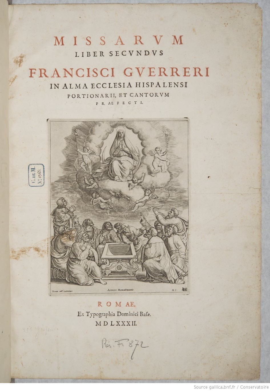 Continuamos la cartografía de la obra de Francisco Guerrero en archivos y bibliotecas estatales o privadas no eclesiásticas con un artículo dedicado a la producción del compositor conservada en la Bibliothèque National de France, la cual listamos cronológicamente: