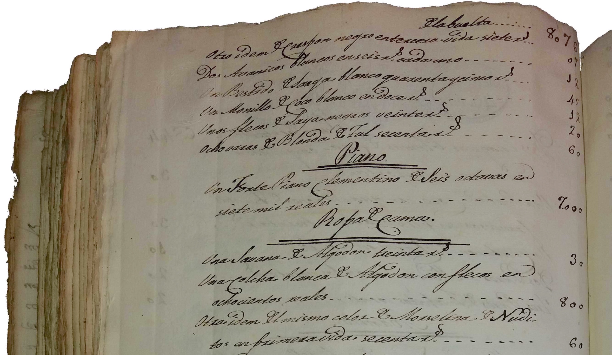 The inventory and appraisal of the personal property that had constituted the dowry of Antonia San Juan Vincenti y Galarza, carried out after her death, at the request of her husband, the Marquis of Iscar, are included in a notarial protocol dated in Seville on October 11 1829. Among the personal objects that were transferred to the Sevillian residence where the couple settled was an English pianoforte from the London factory of Muzio Clementi.