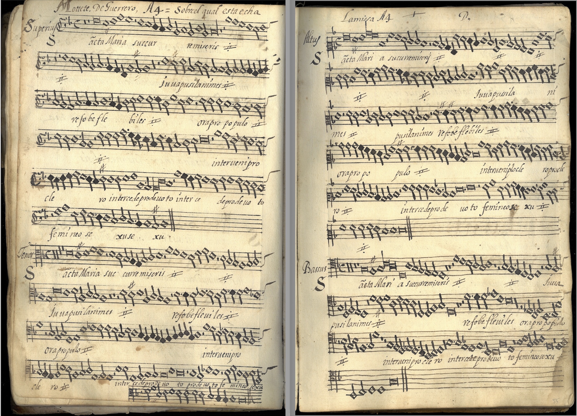 Fols. 26v-27r. Sancta Maria sucurre miseris. “Motete de Guerrero a 4 sobre el qual está echa la misa a 4”. [Francisco] Guerrero.