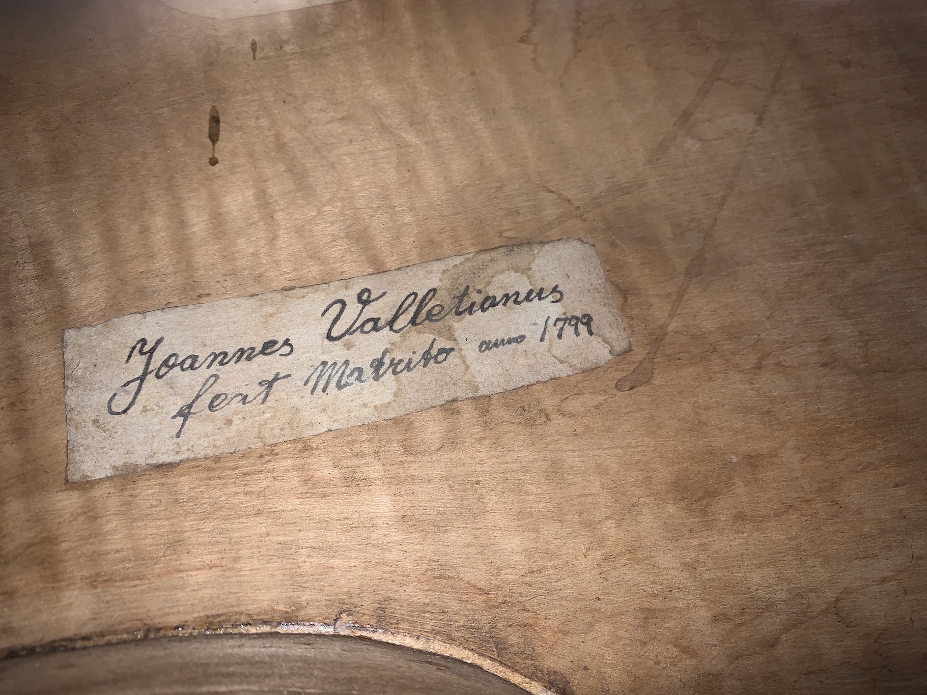 “Geigenzettel: Joannes Valletianus / fecit MATRITO anno 1799 (gedruckt)”.