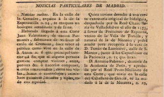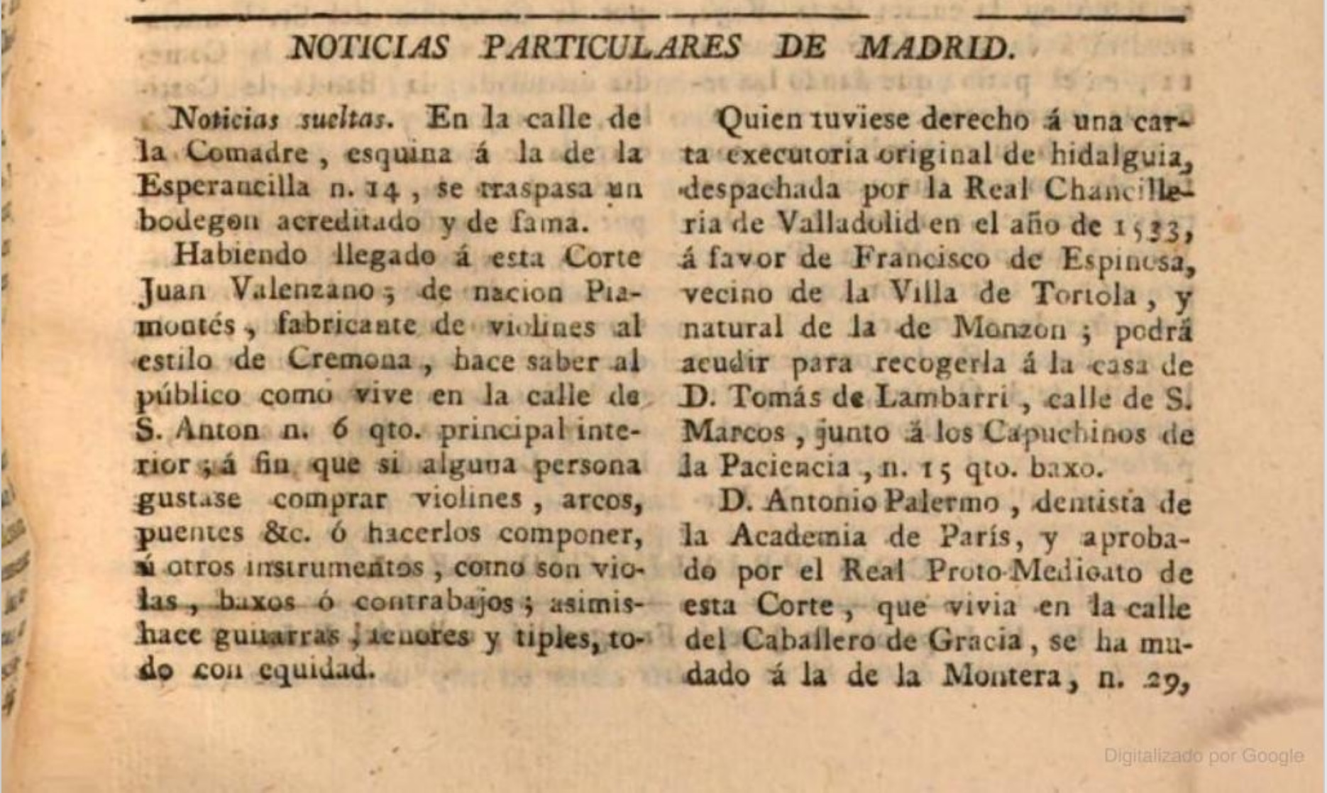 “Habiendo llegado a esta corte Juan Valenzano, de nación piamontés, fabricante de violines al estilo de Cremona, hace saber al público como vive en la calle de San Antón, 6, principal interior, a fin que si alguna persona gustase comprar violines, arcos, puentes, &c. o hacerlos componer, u otros instrumentos, como son violas, bajos o contrabajos. Asimismo hace guitarras, tenores y tiples, todo con equidad”.