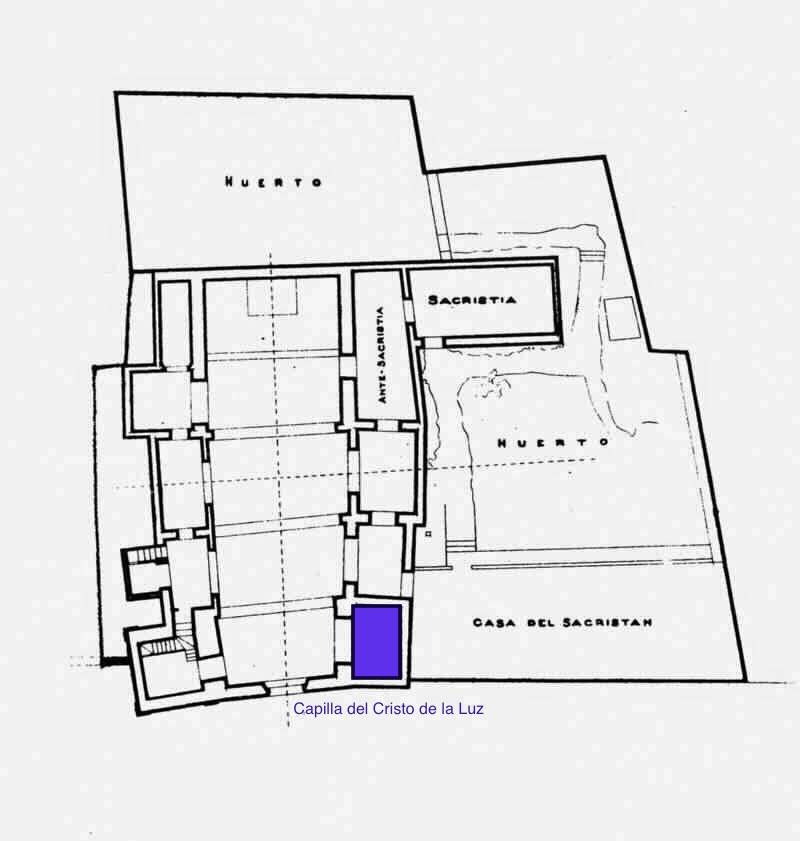 Desde 1734, la imagen se encontraba en un retablo, flanqueada por las esculturas de San Juan de Dios, a la izquierda, y San Luis de Francia, a la derecha, situado en una capilla “a la entrada de la parroquia, a mano derecha”, cerrada con una reja (véase recurso). La iglesia y sus enseres se consumieron durante el incendio perpetrado el 9 de diciembre de 1933. Todo apunta a que la imagen del Cristo de la Luz fuera rescatada de la quema y que perdida su policromía por los efectos del calor sea la que actualmente se conserva con esta advocación en la Casa de los Pisa, atribuida a Diego de Aranda.