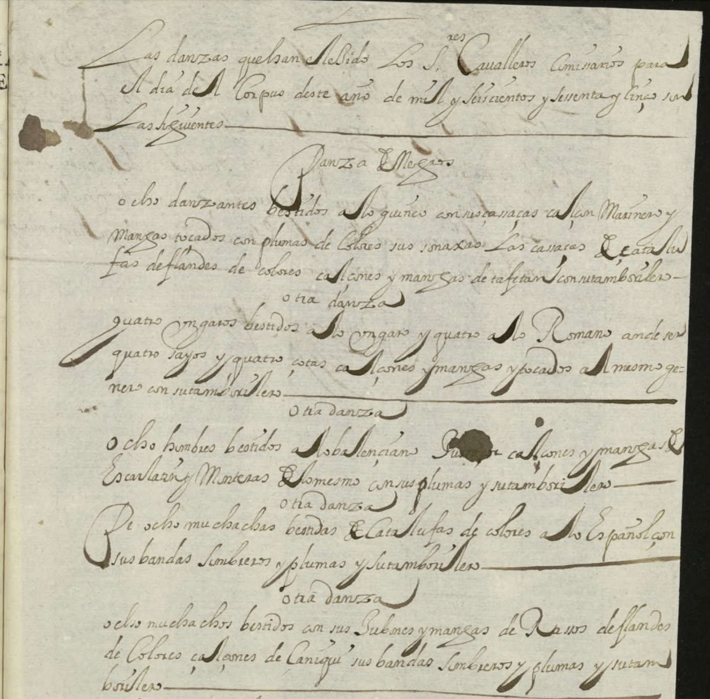 “Las danzas que han elegido los señores caballeros comisarios para el día del Corpus de este año de mil y seiscientos y sesenta y cinco son las siguientes: