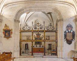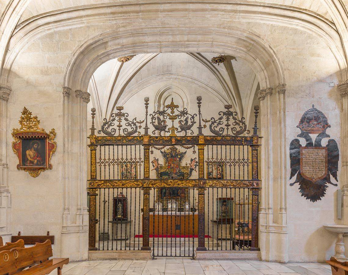 La capilla de San Ildefonso, situada a los pies de la Capilla Real, debajo del coro, en el lado del evangelio, está cerrada por una excelente reja del estilo del maestro Bartolomé que, en su parte central, encima de la puerta del acceso, tiene el escudo imperial, con el águila bicéfala a cuyos lados encontramos dos amorcillos que surgen de sendos cuernos de la abundancia. Actualmente no hay en ella ninguna imagen que pueda identificarse con el citado Cristo del Perdón (el Ecce Homo relicario de Bernardo de Mora estuvo hasta hace unos años en otra ubicación). Existen en la Capilla Real tres lienzos con ese mismo modelo iconográfico, el cual en algunos lugares es conocido también como “Cristo del Perdón”: Coronación de Espinas de Juan de Sevilla (1643-1695) y otros dos, anónimos, también del siglo XVII, que Antonio Gallego Burín nombra como Señor grande de la Humildad y Señor de la Humildad. Este último se encuentra actualmente fuera de la capilla de San Ildefonso, en el lateral izquierdo (véase recurso).