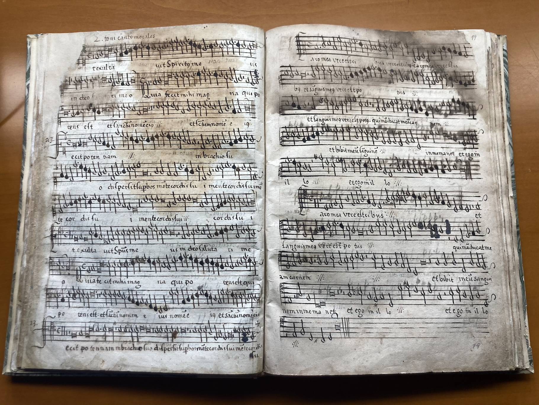 Solo se han conservado las voces de A y B en el recto del fol. 19. En el verso del fol. 18 encontramos las voces de S y T de los versos impares (incompletos) del Magnificat de segundo tono de Cristóbal de Morales, lo que pone de manifiesto que falta un número de folios indeterminado entre ambas obras.