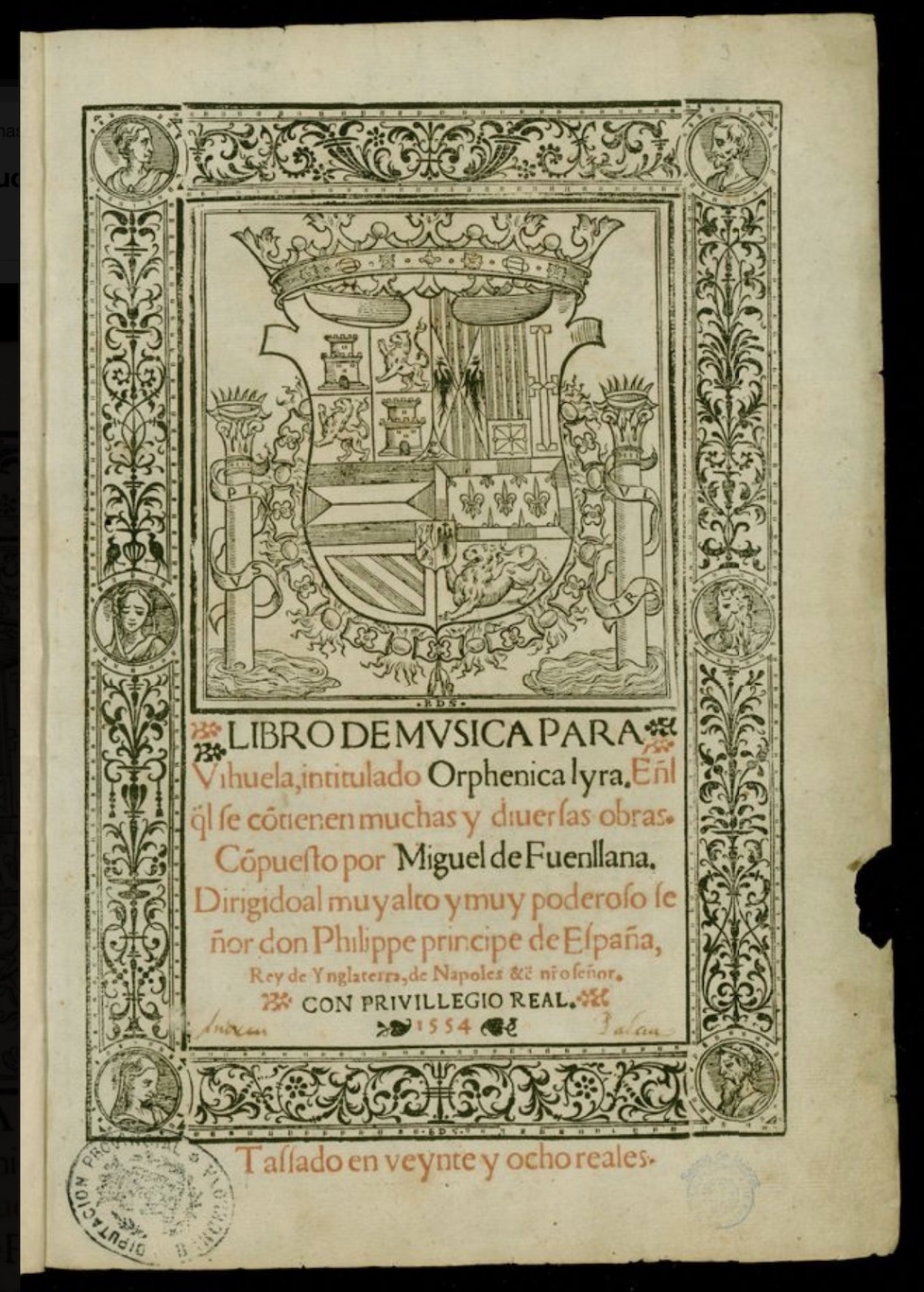 * Libro de musica para vihuela intitulado Orphenica lyra. Miguel de Fuenllana (Sevilla: Martín de Montesdoca, 1554) [155422]. [E-Bbc M 411].