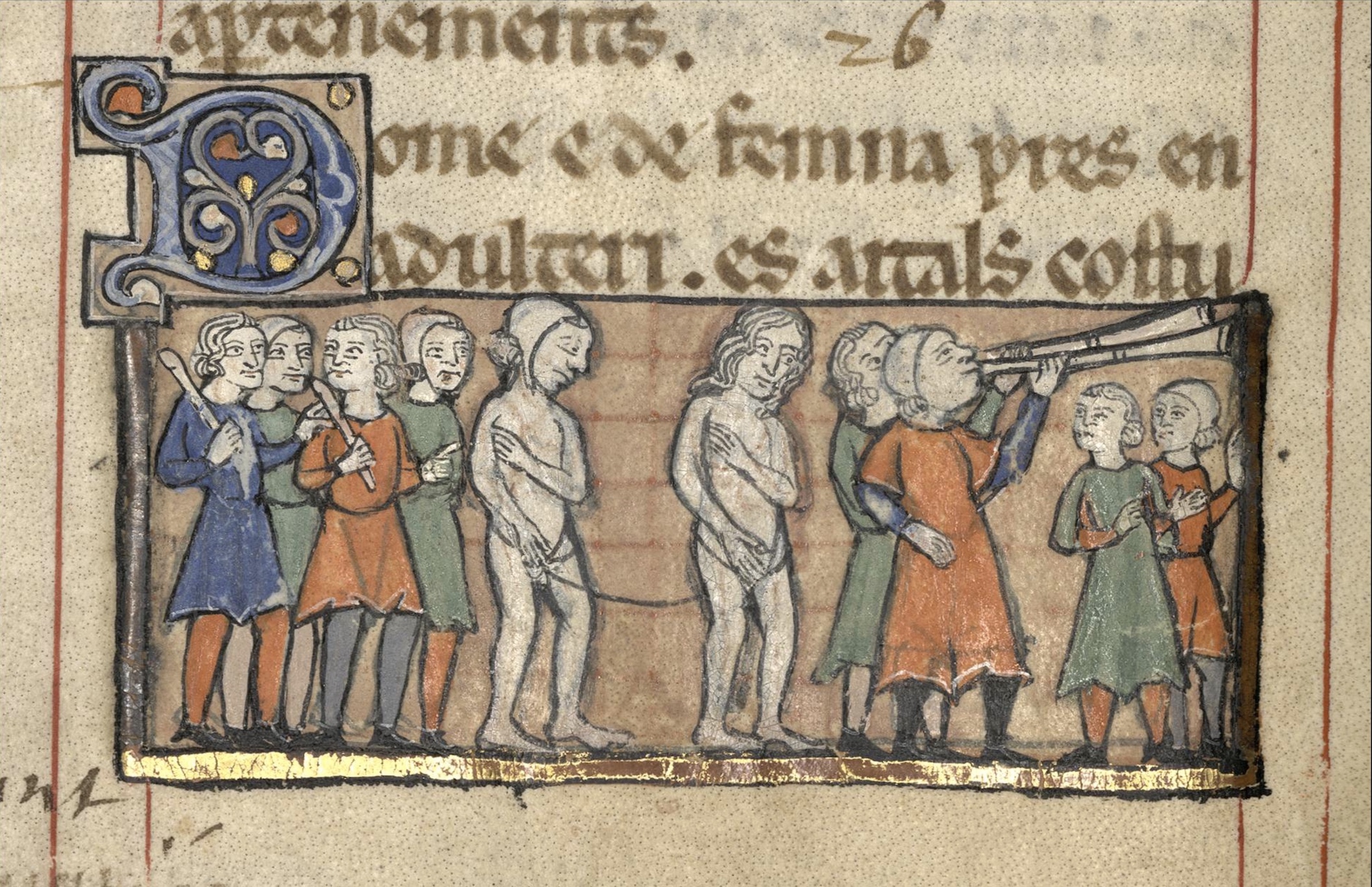 “El hombre y la mujer culpables de adulterio deben ir por la ciudad desnudos, ambos atados con una cuerda, y el señor obtiene 5 sous de multa de cada uno de ellos; y cuando alguien los haya visto, el alguacil, si es avisado primero, debe avisar al consejo, y a la inversa, si es el consejo el que tiene la noticia primero, debe avisar al alguacil. Este debe ir y establecer el hecho, pero debe hacerse acompañado por al menos dos cónsules. El adulterio es flagrante cuando los culpables se encuentran ambos desnudos, juntos o uno encima del otro en la misma cama y si el hombre tiene las calzas bajadas; en los demás casos no hay delito. Si el culpable puede escapar antes de ser capturado o incluso después, no puede ser procesado y no puede ser castigado”.