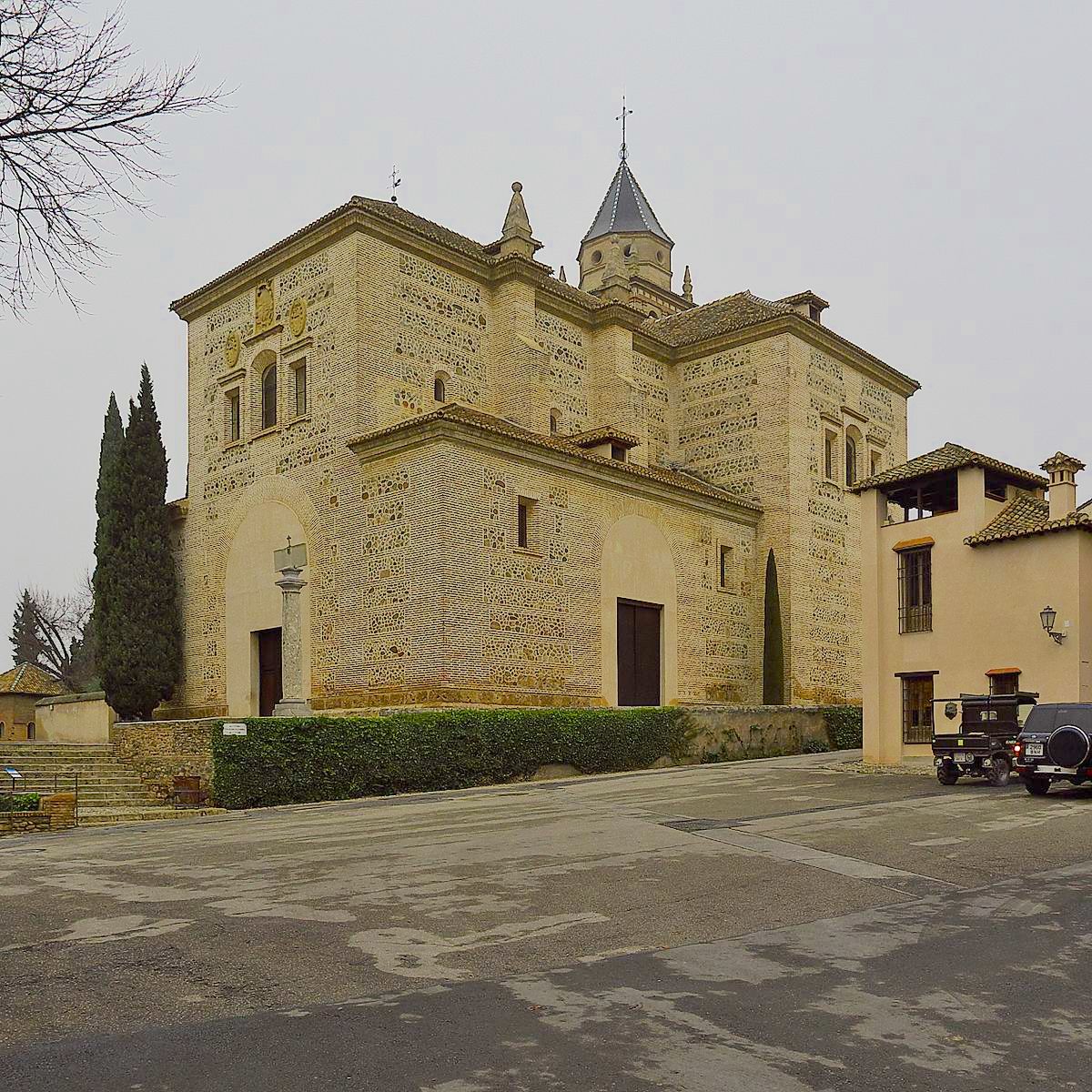 “La parroquial de Santa María que llaman del Alhambra por ser colación de aquella gran fortaleza, tiene el tercer lugar en la iglesias parroquiales y sirvió de catedral recién ganado el reino, habiendo sido mezquita de los moros. Es templo muy suntuoso, fábrica moderna de nuestros tiempos con una hermosísima torre, señoreada a todas las demás parroquiales por estar en lo más alto y más eminente altura con buen campanaje y reloj, opuesta a la de San Salvador, que como se ha dicho está en lo alto del Albaicín. Sírvese de tres beneficiados, un cura y un sacristán”.