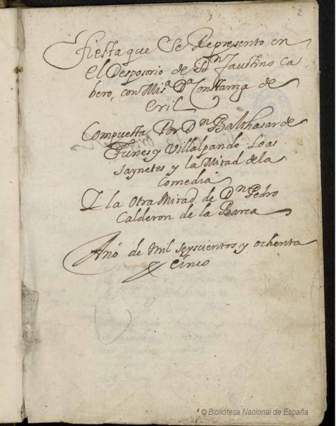 Fiesta que se representó en el desposorio de D. Faustino Cavero con mi señora Constanza de Eril compuesto por D. Balthasar de Funes y Villalpando: Loa, sainetes y la mitad de la comedia y la otra mitad de D. Pedro Calderón de la Barca. Año de mil seiscientos y ochenta y cinco.