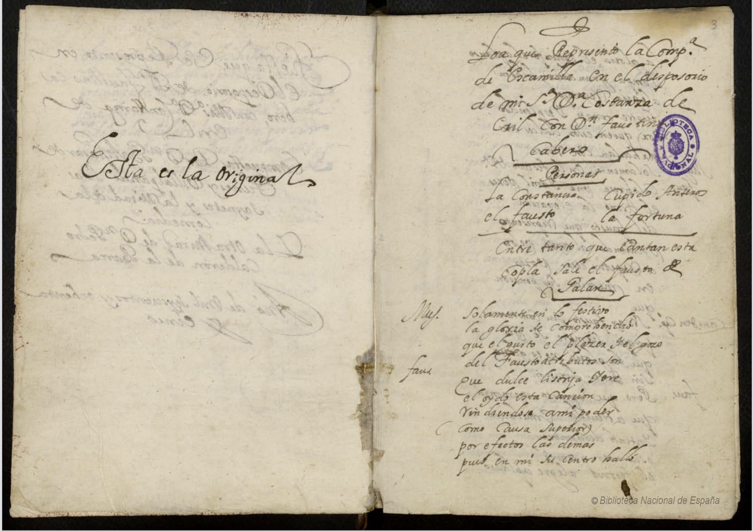 Se indica que “esta es la original”, iniciándose el festejo teatral, como era habitual, con la loa: “Loa que representó la compañía de Escamilla en el desposorio de mi señora D. Constanza de Eril con D. Faustino Cavero”.